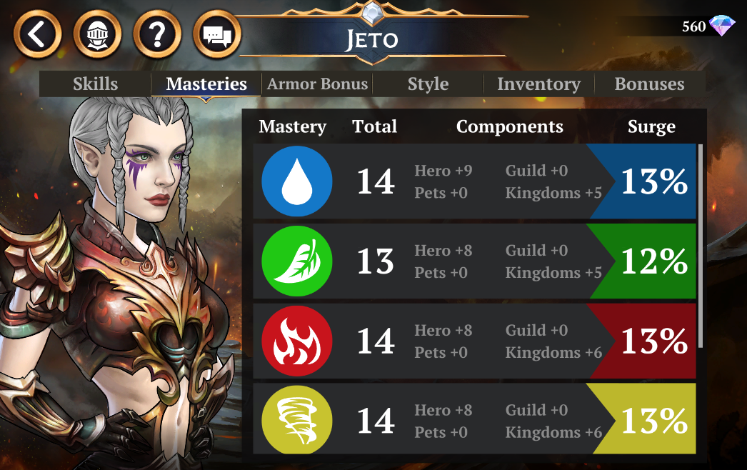 The Masteries tab shows you your current Gem Mastery scores and a break down on where the Mastery points are coming from. The higher your Gem Mastery of a certain color, the more likely you are to receive a Mana Surge for matching Gems of that color.