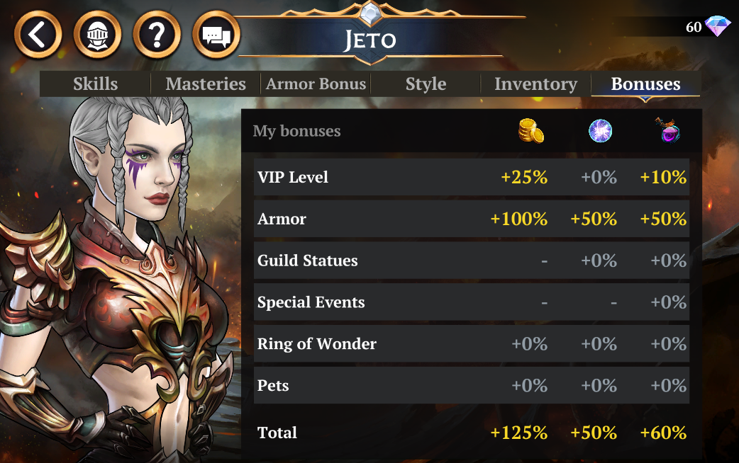 On this screen, you can view a breakdown of your active Hero Bonuses. For more information about the bonuses, see this article.