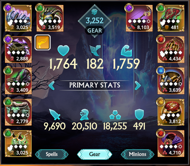 Your Heroes stat will be displayed on the left side of the screen surrounded by the Gear or Spells equipped, replacing your hero model.
