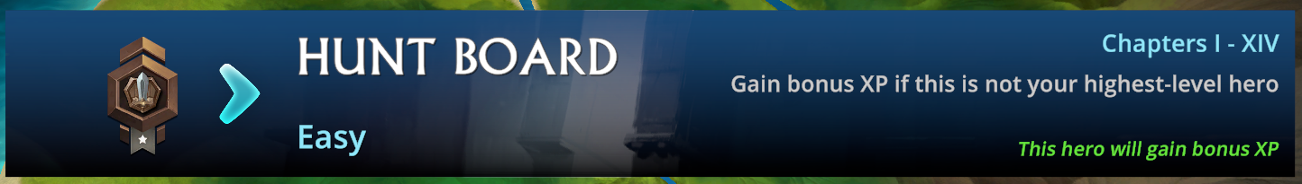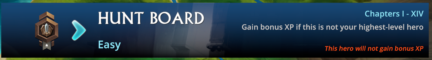 For example, the top screenshot is from the Hunt menu when the Primary Hero is being played. You can see that they will not receive any bonus XP. Compared to the one below of a secondary Hero which will receive bonus XP.