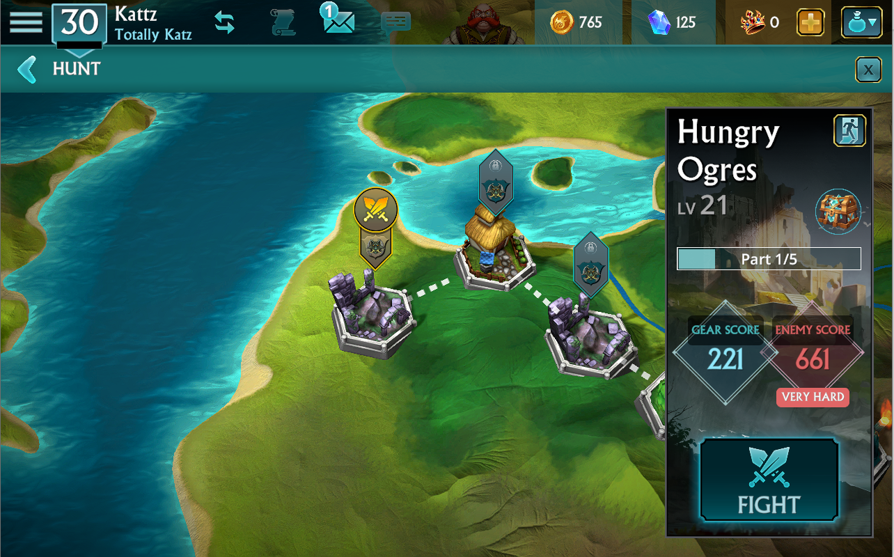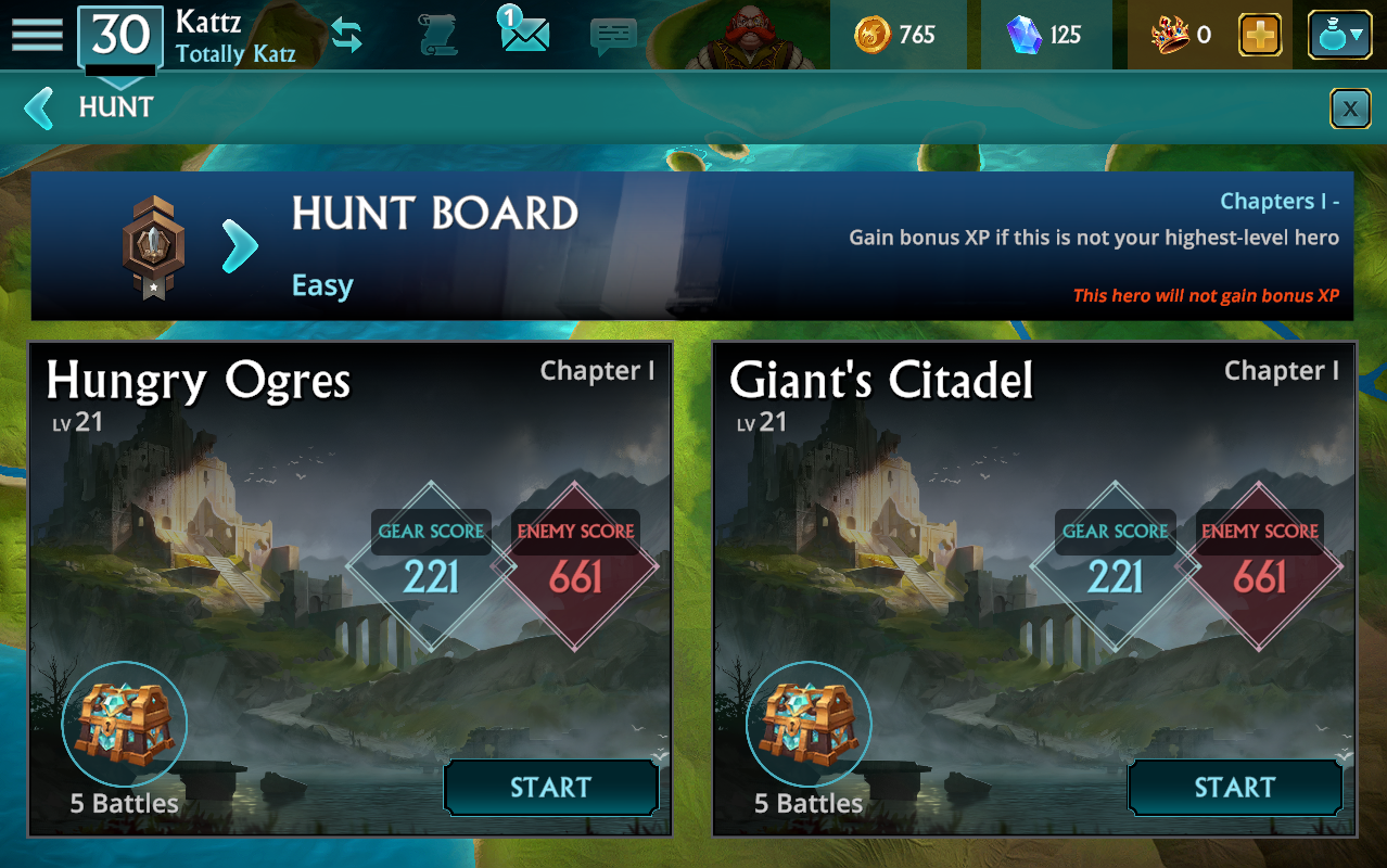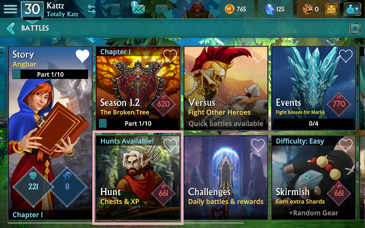 Hunt battles are available when your first hero reaches Level 7. Accessible via the Battles tab, Hunts are aimed toward your secondary Heroes giving you the ability to earn XP without having to play through the Story again.