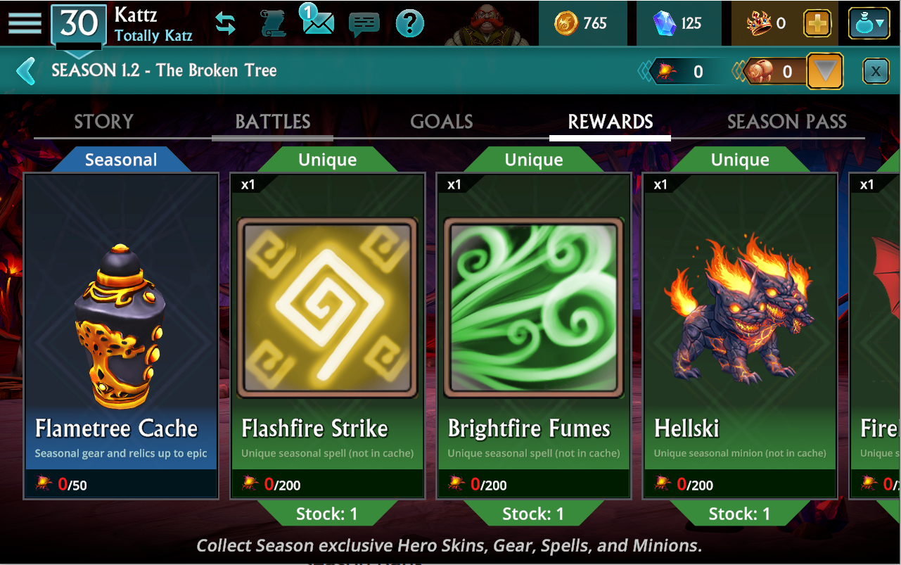 Each Season has its own Seasonal currency awarded from completing battles and Season Goals, these can be spent to unlock the unique Season rewards such as Minions, Spells, Hero Skins and more.