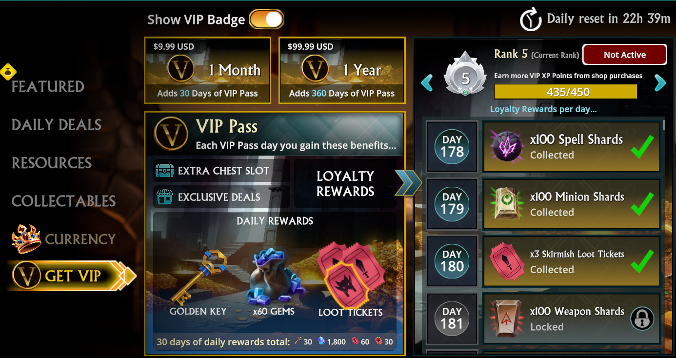 In the Shop you can purchase a VIP Pass, as either a Monthly (30 Days) or Yearly (360 Days) Pass. These can also be stacked to equal a maximum of 400 Days. To access the VIP Rewards and VIP Pass Purchase screen go into Shop > Select VIP Pass